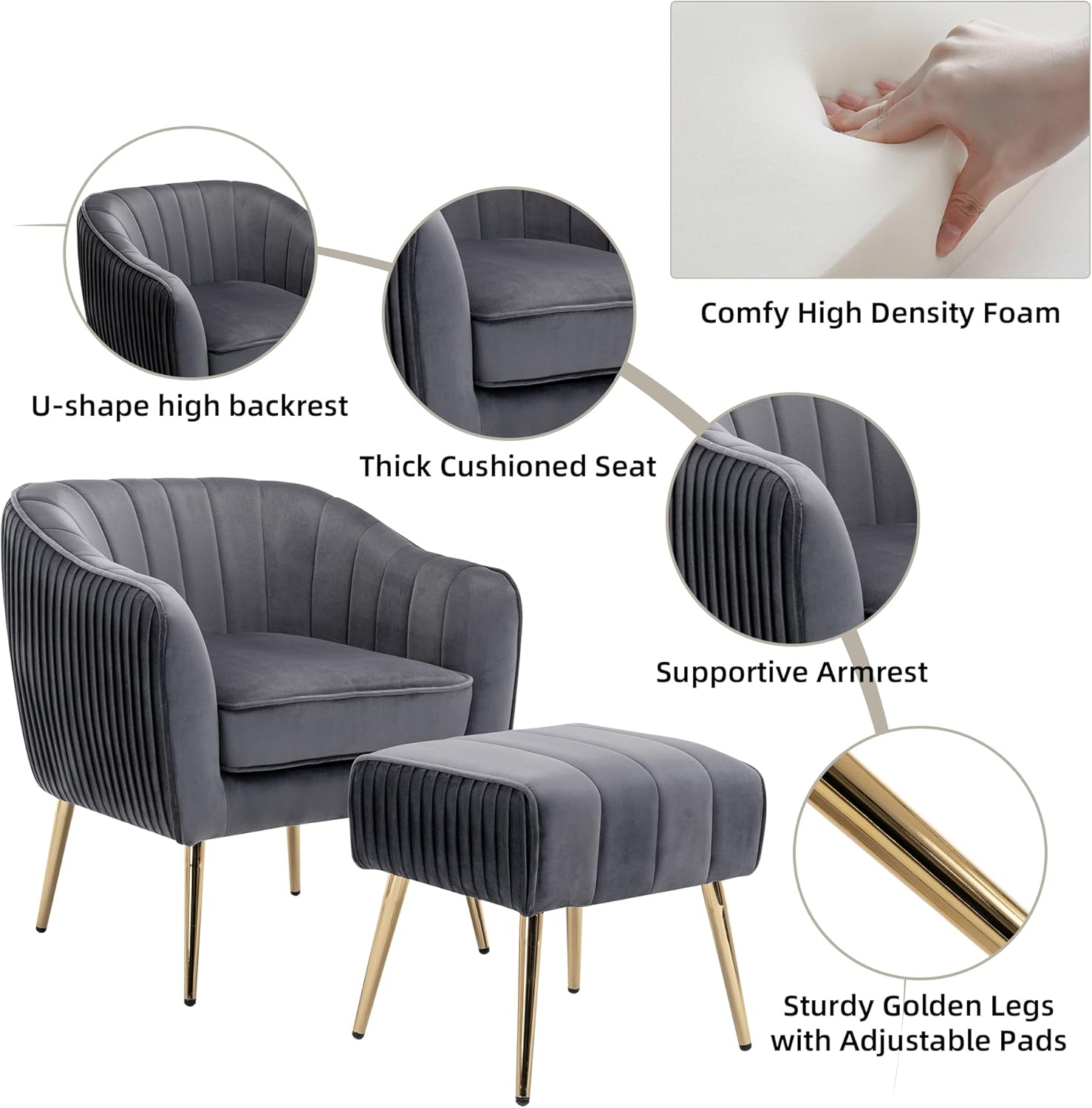 Ultimate Comfort: Our Velvet Accent Chair and Ottoman set is designed for maximum relaxation. With a high backrest, thick cushioned seat, and supportive armrest, you can lounge comfortably for hours