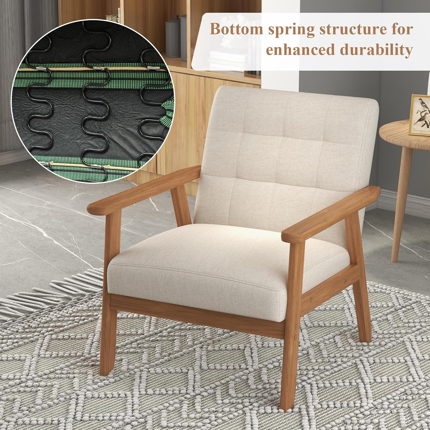 Accent Chair Set of 2, Mid-Century Modern Living Room Chairs with Solid Wood Frame & Soft Thicken Cushion, Upholstered Arm Reading Chair for Bedroom, Balcony, Beige Linen Fabric & Natural Legs